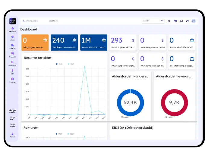Finago Office er en av Nordens mest komplette forretningsplattformer – bygget for moderne selskaper som ønsker alt på ett sted. Med funksjonalitet for regnskap, CRM, prosjektstyring, timeregistrering, fakturering og rapportering, gir 24SevenOffice deg full kontroll på tvers av virksomheten.